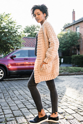***Every wardrobe deserves a chunky cardigan. Create a layered look for fall and winter with the Kima Cardi.*** The overall feel is comfy and cozy without being too heavy. The cardigan is constructed in simple pieces, then seamed together. The thick neckline ribbing and deep pockets are the finishing touches. Styled with ripped jeans, a pencil skirt, or pajama pants, you’re always dressed for the occasion with a handmade cardigan.
