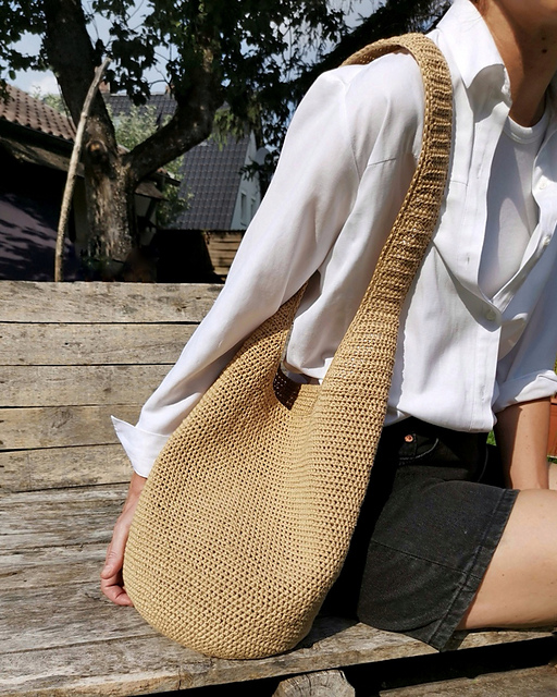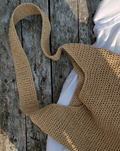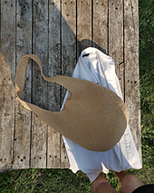 Die Tasche hat eine runde Grundform und wird in Spiralrunden gehäkelt, so dass keine ‚Naht‘ entsteht. Der Schulterriemen wird in zwei Teilen in Reihen gehäkelt und zum Schluß an der Schulter zusammengenäht.