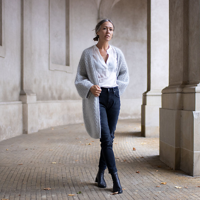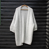 **CARDI COCOON** is a soft and fluffy cardigan with a simple and elegant honeycomb cable pattern. The cardigan is worked from the top down. First the neck edge for the back of the neck is worked, then the back section of the yoke is worked down from there. After this, stitches are picked up along the back shoulders for the front sections of the yoke. The back and fronts are joined at the bottom of the armholes and the body is worked back and forth across all stitches to the hem. Finally, stitches are picked up for the sleeves along the armholes and the sleeves are worked in the round to the cuffs.