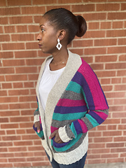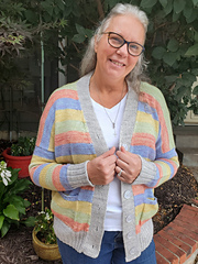 The Douglas Cardi is a grandpa-style cardigan complete with stripes, big pockets, and a relaxed fit. Named for my father, who is now fondly known as Grandpa Doug to my kiddos, it reminds me of when I spruced up my school uniform with my own grandpa’s golfing cardigan when I was in middle school. I love to amp up my cozy with this sweater no matter the outfit! This sweater is knit from the bottom up with afterthought pockets and a sewn on button band.