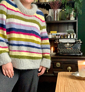 Sweateren strikkes oppefra og ned. Den har en form for sadelskulder, der er placeret på ryggen frem for på skulderen, hvilket gør den “usynlig” forfra. Der sættes masker af til ærmer og kroppen fortsættes lige ned, og afsluttes med en bred ribkant. Ærmerne strikkes herefter et ad gangen, med indtagninger på undersiden og afsluttes ligeledes med en bred rib. Til sidst strikkes en bred rib langs halskanten. Der er seks størrelser, vælg den der er tættest på dit brystmål. Sweateren har et bevægelsesrum på ca. 15-17 cm, dvs. den er løstsiddende.