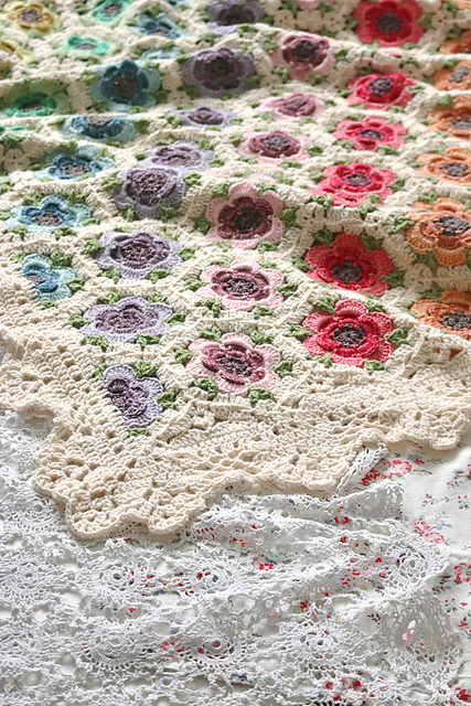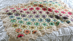 A beautiful rainbow of hexagon flowers dance across this blanket and are framed with a pretty floral border. Hexagon motifs are worked together using join as you go, then a border is added by working in the round.