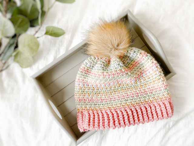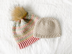 Worked bottom up and in the round in sizes Newborn to Adult L. The moss stitch is so quick to work up and very beginner friendly.