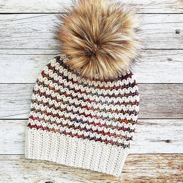 The Timber Ridge Beanie is a beautiful, cozy beanie pattern perfect for fall weather! This hat features pretty knit-look ribbing, zigzag striping, and it works up quickly with simple stitches!