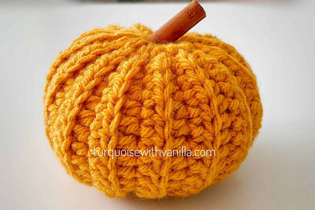 For my crochet pumpkin I’ve used 40g 100% acrylic, 6 mm crochet hook, polyester stuffing and a a cinnamon stick for the stem.