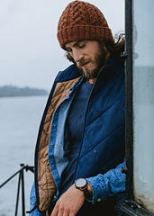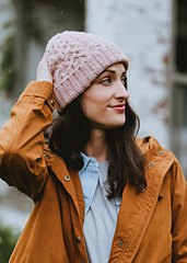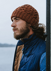 **Rhett** by Meghan Babin is a classic cabled beanie made for gatherings around fall campfires, weekend hikes, blustery days, and is a go-to hat that will surely be stuffed into coat pockets from fall through the winter. Made with a deep, squishy fold-over brim, the cables flow naturally from the brim ribbing and decrease away seamlessly into the crown.