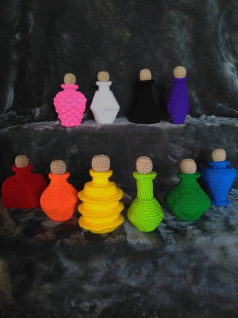 This pattern contains instructions for ten different styles of bags and a removable cork. The difficulties range from beginner to intermediate beginner, depending on the style. All bags are designed so that average sized polyhedral dice can fit through the neck/opening.