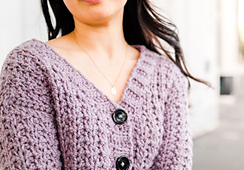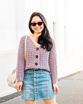 Perfect for day or night, the Twilight Cardigan is a modern take on a fall staple – the button-down cardigan. Simple stitches and chunky yarn combine to make a textured v-neck cardigan that will keep you warm from the crisp autumn winds. Designed as a cropped cardigan, you’ll be surprised at how quickly this pattern works up and there are also instructions to customise length!