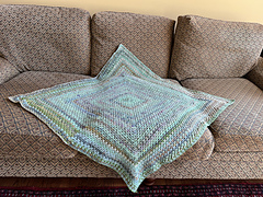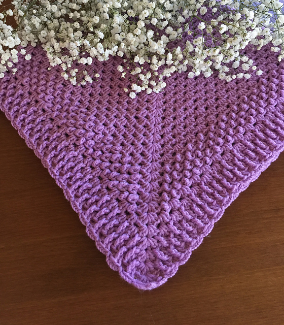 This square blanket starts at the center, works in the round and out towards the border. It has three sections and one round of simple scallop edging. Totally 41 rounds. The instructions are written for a newborn baby size with notes at the end of the pattern explaining how to customize your blanket.