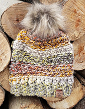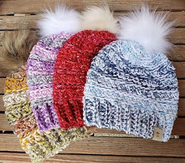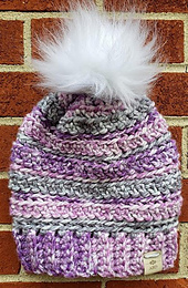 Gauge is not pertinent for this pattern, since the hat is adaptable and customizable. If worked exactly as written, the final size is 8.5” x 8” tall, laid flat and unstretched. The final dimensions are very easily customizable by adding or subtracting rows as you work the ribbing and the body.