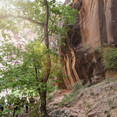 Of the 229 square miles that make up Zion National Park, most visitors spend their time in the long narrow canyon that makes this park so popular. The spectacular reds and oranges of the canyon walls, the green of plants and trees that seem to sprout out of cracks and crevices, and the blues of sky and water create an unforgettable and much beloved scene. Whether you’re hiking the famous Narrows, Angels Landing, or Emerald Pools trails or simply picnicking in a quiet spot along the river, the grandeur of the canyon surrounds you in a palette of warmth and beauty. This design, filled with the texture and color of the park, takes you from a forest of cottonwood trees, up the canyon walls. to the dark “desert varnish” that paints the orange sandstone with dark streaks. Near the base of the hat, the Virgin River runs throughout…a reminder of the ever-present force still shaping the canyon today.