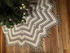 This pattern creates a slightly more than circular star-shaped skirt with an opening to wrap around your Christmas or Holiday tree. It has nine large points and eight small points and a custom twisted fringe icicle edge.