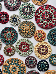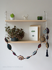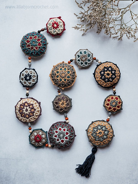 You can either make separate mandala motifs and use them as coasters or hanging ornaments, or join pairs of motifs together, stuff them and assembly into a garland.