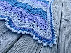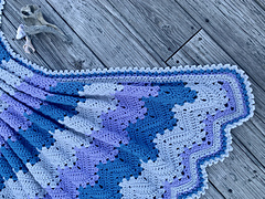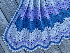 This pattern is a variation of the 6-Day Kid Blanket (6DKB) and makes an adult-sized throw blanket. To achieve the wide, lacey stripes we have altered the original pattern to change colors on different rows than the original 6DKB. There are a variety of ways to alter the look of the 6DKB by changing colors on different rows, and this particular variation is known as the Snowflake Effect. It is the most popular and the most often requested variation.