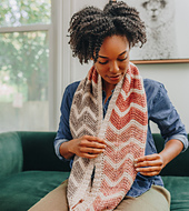 Fine merino wool yarns make this cowl lightweight and perfect for transitional weather. The chevron pattern is worked using well-placed increases and decreases and features a subtle color sequence. A narrow applied ribbing adds an understated, clean finish.