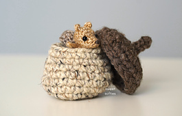 The Baby Squirrel in Acorn pattern includes instructions for a miniature, newborn squirrel and his acorn home. The Acorn is large enough for the little critter to hide within, making this a fun pretend play toy set for young children. This is a very small but quick amigurumi project. It makes a wonderful gender neutral (unisex) gift for boy sand girls alike, and is great as decor for woodland themed nursery rooms.