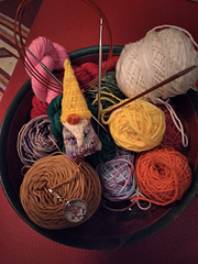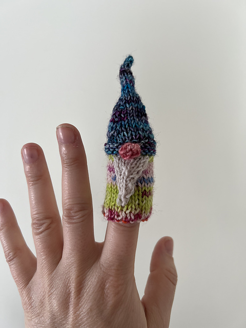 Knit with sock yarn scraps on US 2.5/3.00 mm double pointed needles. You will need 4 different colour scraps for hat, body, nose and beard. Nose and beard could be knitted in the same colour.