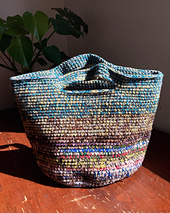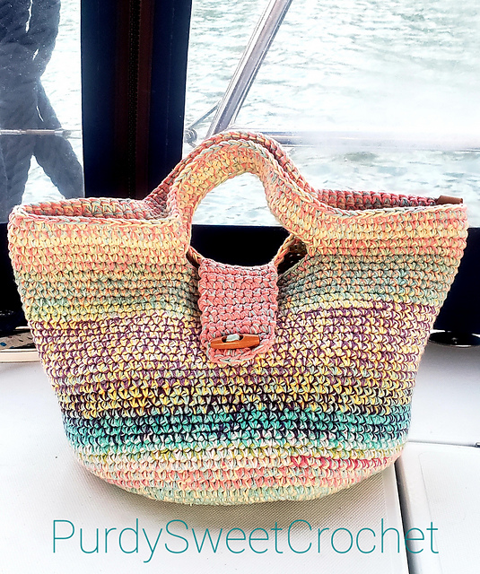 Here's a fun way to use up your cotton yarn scraps to create a unique travel tote or project bag. Made with three strands of yarn held together throughout and worked only in SC.