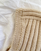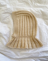 The Sunday Balaclava Baby is worked from the top down in rib, which at the neck transitions to a circular yoke with rib and increases. First a square is worked for the top of the head. Then stitches are picked up and knitted along both sides of the square with decreases along the face opening. The balaclava is worked back and forth down to under the chin, where it is joined to be worked in the round in rib and shaped with increases. At the end, a rib edge is worked around the face opening.