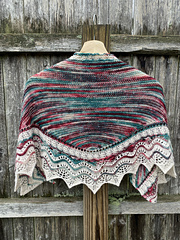 **Velvet Frost** is a shallow triangular shawl. The shawl is worked bottom-up starting with the lace border. The body is knit in garter stitch pattern and shaped into a shallow triangle with the short rows knitting technique. The body and the lace part is visually separated with the row of eyelets. The shawl's top edge is finished with the I-Cord bind off.