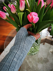 The thumb gusset is created by symmetrical increases, worked in stockinette stitch, and finished with 1 x 1 ribbing.