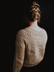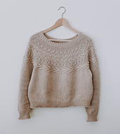 The Oksa sweater is knit top down in the round and features a yoke design with slipped stitches, cables and simple knit and purl designs.