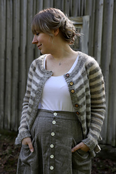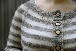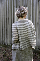 Vaaka is a loose and relaxed stripy cardigan that is worked flat, top-down and, of course, seamlessly. The cardigan has a round yoke and fun stripes in two different yarn weights. The cardigan has positive ease and a cropped hem. The back of the neck is shaped taller with short rows. The button bands are picked up and worked last.