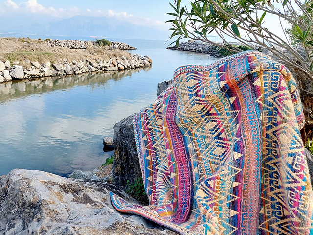 Mosaic crochet pattern ANCIENT STORIES combines simple geometric shapes with ornaments to create an eye-catching result! The pattern allows you to create any size blanket or other projects by adjusting the number of repeats in width and in height. Two layout variations are included; both go nicely with the included border pattern.