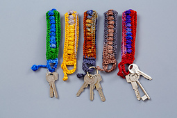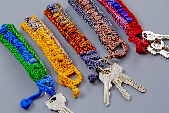 **Materials:** about 8-10g leftovers of Urth Uneek Worsted, per keychain, shown in 4004, 4001, 4017, 4021, 4007