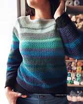• Yarn: 1250 (1350, 1500, 1650, 1850) (2100, 2300, 2500, 2700) yds or 1140 (1230, 1370, 1510, 1690) (1920, 2100, 2290, 2470) m of any DK weight yarn you can meet gauge with. My teal sample uses Katia Missouri, and my striped sample uses a combination of Scheepjes Catona and Schachenmayr Catania from my stash of scraps