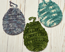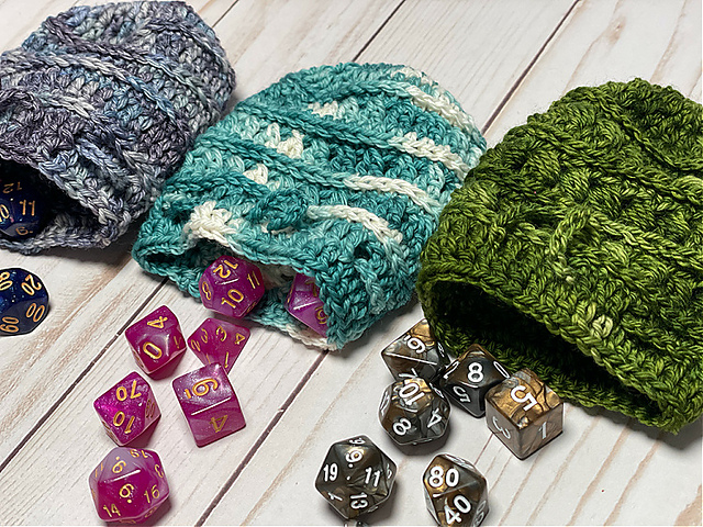 The pattern includes 3 different styles, each following the same pattern but using a different stitch in alternating rows. One uses rows of double crochet, another uses crossed double crochet, and the last uses the bead stitch.