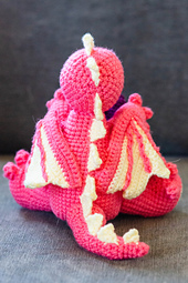 Amigurumi dragon holding a bag. The finished bag holds around 60 polyhedral dice.