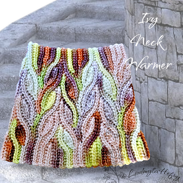 The **Ivy Neck Warmer** is made vertically, flat, in one piece. Repeating panels are connected as you go. The Ivy stitch pattern is created using short rows and slip stitches that are smoothly integrated into the upper and lower ribbing edges.