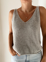 Home Camisole is a wardrobe staple created using cashmere yarn. It is extremely soft and comfortable to wear close to the skin. It is made to upgrade your everyday essential garments, think of all the possibilities. It is constructed from the top down giving it an advantage for adjusting the length of the body. Simple stockinette stitch is used throughout the pattern and it is framed along the v neck, arms and waist with an i-cord edging. Camisole is meant to be worn with 0 to 5 cm (0 to 2”) of positive ease.