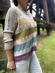 Main Yarn: 5 (5, 5, 5, 6, 6, 6, 6, 6, 6) skeins in 5 different colors of *Reunion Merino Silk Sport* by Circus Tonic Handmade (50% superwash merino / 50% Silk; 383 yds [350 m] / 100g) or 900 (1034, 1149, 1225, 1627, 1692, 1742, 1953, 2018, 2068) yards [822 (945, 1050, 1120, 1487, 1547, 1592, 1785, 1844, 1890) m] of sport weight or heavy fingering weight and 1 (1, 1, 1, 1, 1, 1, 2, 2, 2) skeins of *Feather* by Magpie Fibers (70% Mohair / 30% Silk; 470 yds [430 m] / 50g) or 352 (352, 352, 352, 470, 470, 470, 587, 587, 587) yards [322 (322, 322, 322, 430, 430, 430, 537, 537, 537) m] of laceweight yarn.