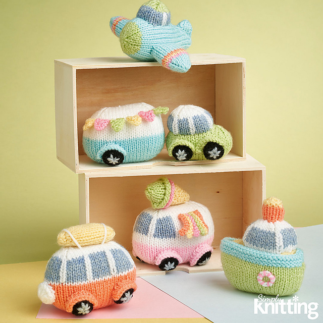 Designed by Amanda Berry @fluffandfuzz, the vehicles are knitted in acrylic DK yarns on single pointed needles (not in the round). The ice cream van pattern incorporates intarsia colour-work, and the other vehicles use duplicate stitch embroidery (Swiss darning) for the finishing touches.