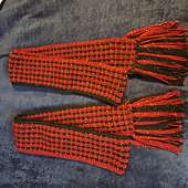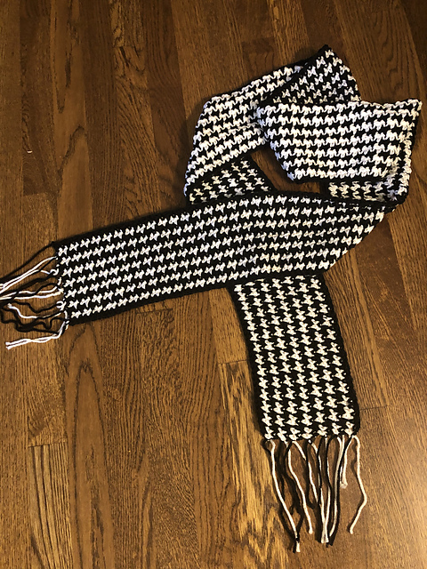 This pattern eliminates that problem of frequent color changes in houndstooth patterns by stitching lengthwise and incorporating the color changes into the fringe on the short edge of the scarf or blanket blanket.