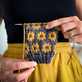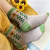 This set includes two patterns. Sunflower Power has a fun colourwork flower pattern that runs throughout the leg and foot and has a short row heel. Sunflower Rises has a sunflower inspired colourwork detail on the leg, a heel flap and gusset and includes a plain stockinette foot section.