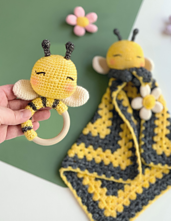 Honey the Bee Lovey is a crochet animal attached to a granny square blanket. Perfect for teaching new babies to snuggle, and bring comfort and sweet dreams. Honey the Bee Rattle helps with hand-eye coordination and motor skills. A perfect gift set!