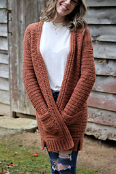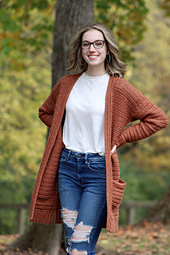 The Harvest Cardigan is THAT item in your closet that you will wear again and again because you love the way it feels. So soft and comfy, this easy-to-make cardigan features classic sweater ribbing on the bottom and cuffs for that familiar texture and POCKETS for all your important things. This project uses basic stitches like single and double crochet and can be customized for length. The cardigan is meant to be relaxed and easy to wear without being oversized, and the suggested yarn just gets softer every time it's washed. You'll want to just live in this cardigan. I hope you love it!