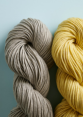 - 2 skeins of Purl Soho’s [Morning][1], 75% organically grown cotton and 25% yak. Each skein is 191 yards/ 100 grams; approximately 250 (270, 300) total yards required. We used Grassland Gray and Yellow Apple.