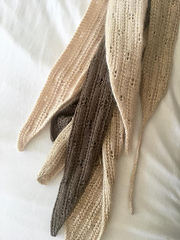 The pattern for the Augusta Lace Scarf includes three different options: a tiny scarf, a slightly bigger scarf that can be wrapped around the neck twice, and a head band with I-cord ends. All three variants are knit up from tip to tip. Thanks to different increases and decreases, the three options vary slightly in their shape. The Augusta Lace Scarf is perfect as a **scrap yarn project** or for **gifting**. You can work it up with either two strands of lace weight yarn or one strand of fingering weight yarn.
