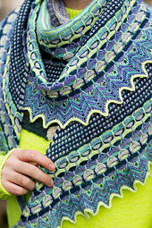 *Choose five colors of fingering weight yarn to knit this beautiful semi-circular shawl. This pattern is knit seamlessly from the top center down to the chevron border. Simple sections of stripes and slip stitches alternate between the multi-color slip stitch sections. You only work with one color at a time, resulting in a mesmerizing and elegant pattern. The final chevron section decorates the border followed by an I-cord bind off. Select five high contrast colors for a bold statement or try five soft shades for a more subtle shadow effect.*