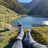 The midnight in Zermatt socks are perfect for wearing while hiking up a mountain, after a day of skiing or for relaxing by a cozy fire with a warm cup of cocoa. These socks are named after the magical village of Zermatt in the Swiss Alps, which famously sits under the majestic Matterhorn mountain. Inspired by the colors of the town in winter, with its dark blue night sky and purple streets below covered in glistening snow, these socks have a simple, easy-to-knit colorwork motif reminiscent of the mountain peaks.