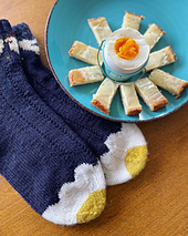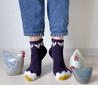 This shortie sock (can be adapted for a longer sock too), is knit from the top down with a short twisted-rib cuff. It has a chicken colorwork section which includes some duplicate stitches for the chicken’s beak and wattle (a new word for me!). The leg is knit with an easy-to-memorize textured pattern on the foot and has a ribbed heel flap and gusset. The sock is completed with an “egg toe,” which is created using a small section of colorwork.