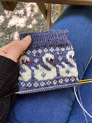 Knit from the top down with a ribbed cuff, this sock includes a swan colorwork pattern on the leg (with optional duplicate stitch sections