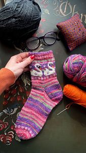 for the eyes and beak) and finishes with a little simple colorwork detail before the toe is knitted. These socks are knit with a ribbed
