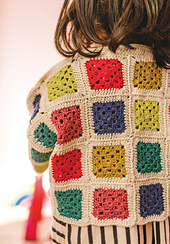 **Notes:** Battenberg is constructed from a number of separately- worked granny squares. The squares are joined together while a double crochet border is worked; refer to the appropriate diagrams when laying out pieces and working the joining rows. Note that some sizes have half-squares at the side seams, and all sizes feature a triangle on each front; the remainder of the shapes are squares. Finally the garment pieces are joined and a button/buttonhole band worked around the front opening.