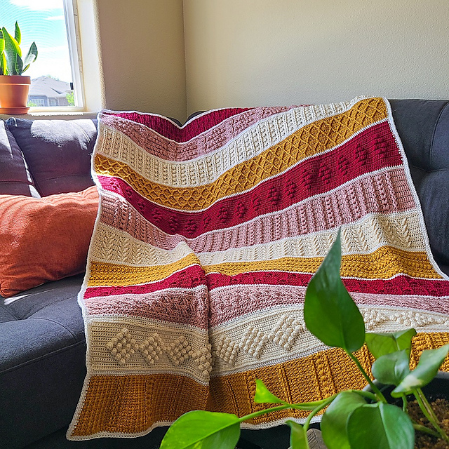 This free crochet along blanket pattern is made out of 12 different stripes that are worked on top of each other (no joining here!), and are separated by 2 transition rows.