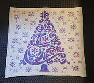 A pattern for a blanket with a swirly Christmas Tree, made in Overlay Mosaic Crochet (US English and Dutch), working from right to left only, alternating colors, cutting off yarn after every row.